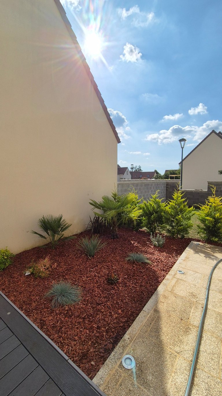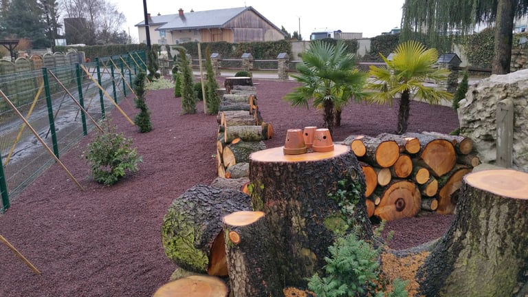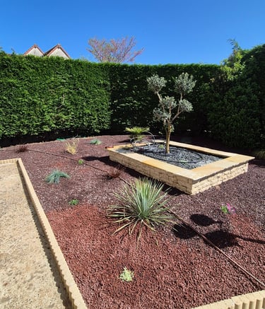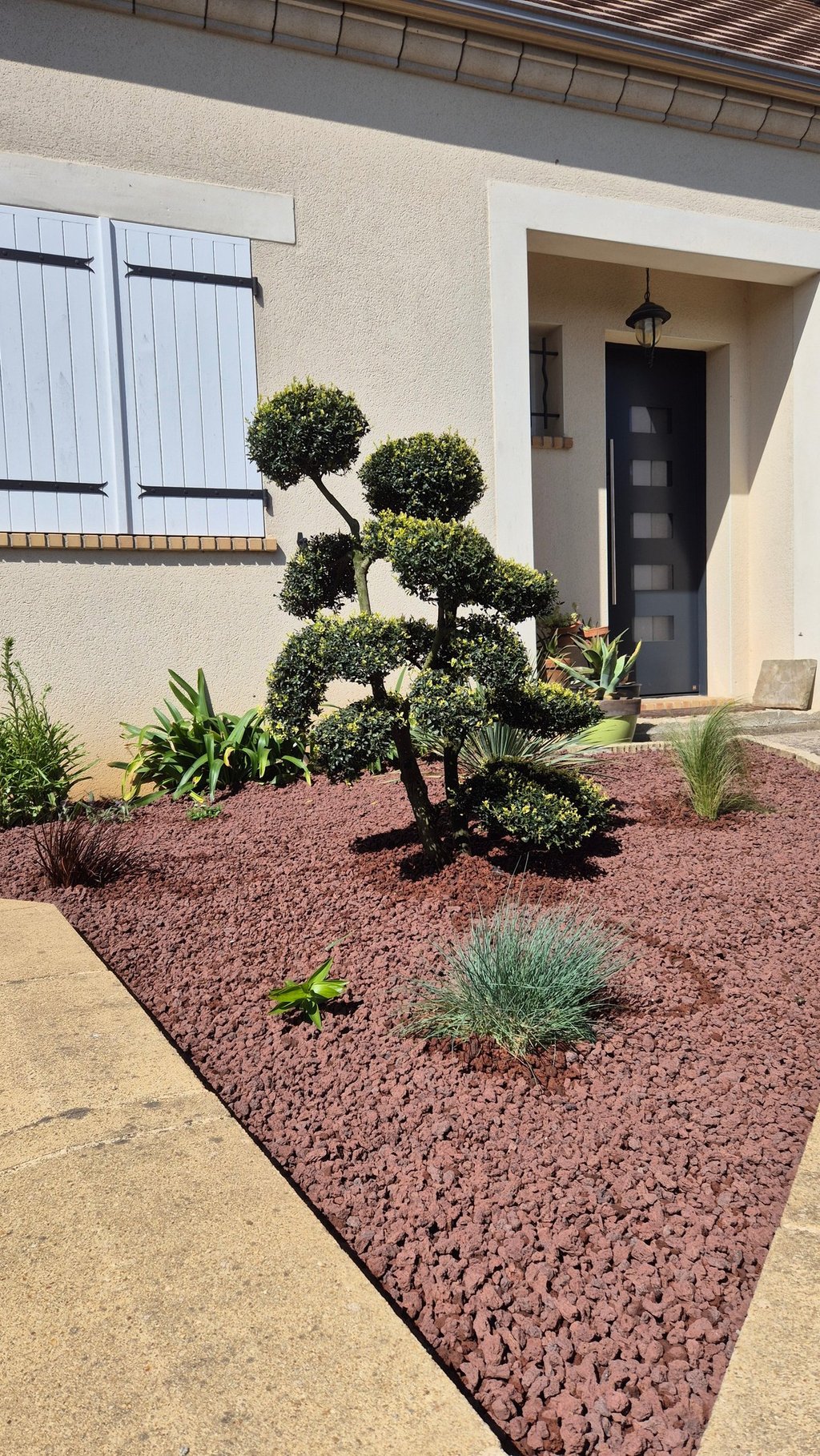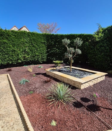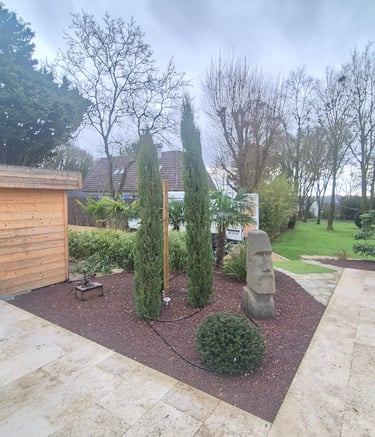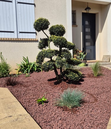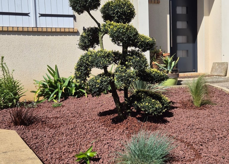 Création de coins jardins décoratifs avec bonsaï, plantes grasses et du pouzzolane, une pierre volcanique, pour sublimer et structurer l’espace extérieur. Un aménagement zen et élégant qui transforme le jardin en véritable espace de vie.